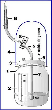 Componentes: Frasco coletor(1),Etiqueta volumétrica graduada  (2), tapa (3), Asa de transporte (4), Tubo de drenaje (5), Conector cónico (6), Tubo de sellado de agua (7), Presilla (8), Respiradero de salida de gases (9)