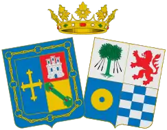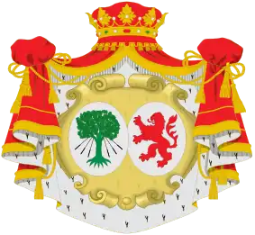 Escudo de Armas de la v duquesa de Castro Terreño, bajo el manto de grandes de España; los Villar-Villamil, un árbol de sinople sobre plata; los Ezpeleta, un león rampante de gules sobre plata.