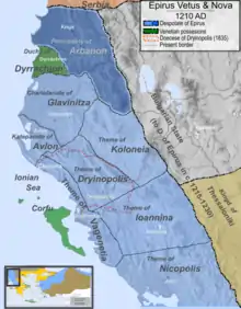 ![]() Mapa de Epiro c. 1210, con el Ducado veneciano de Durazzo y Corfú (en verde) y el Despotado de Epiro (en azul) Ubicación de Ducado de Durazzo | |||||||||||||||||||||||||||||||