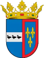 Escudo partido. Primero, en campo de azur, una faja de plata, con tres ánsares de sable, picados de gules y puestos en faja. Segundo, en campo de azur, tres flores de lis de oro y bien ordenadas; la bordura es de gules y el lema: «Regina coeli juvante».[2]