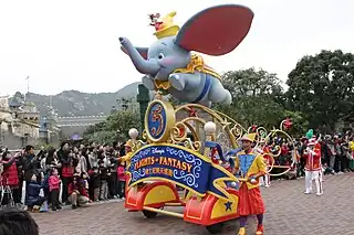 Dumbo es un elefante de color gris con enormes orejas. Usa un sombrero amarillo, así como también un collar rojo.