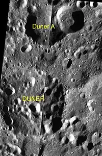 ![]() Localización de Dunér Dunér es un antiguo cráter de impacto que se encuentra en el hemisferio norte de la cara oculta de la Luna. Se halla situado al sureste del cráter Chernyshev, y al oeste-suroeste de la pareja de cráteres Perkin-Debye. Este cráter ha sido muy afectado por múltiples impactos pequeños, dejando un borde exterior que a duras penas puede apreciarse, formando poco más que un leve resalto circular en la superficie lunar. El interior está en condiciones similares, con pequeños cráteres que cubren muchas partes de su plataforma. Los impactos más notables consisten en una cadena de superposición de pequeños cráteres que se extienden desde cerca del punto medio y cruzan el borde sudeste. Esta cadena es de mayor longitud que el diámetro del cráter principal. |
