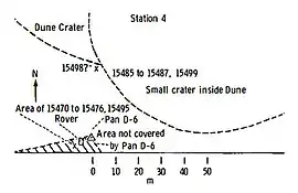 Las muestras 15470 a 15476 se recogieron cerca de donde estaba estacionado el rover, al sur del borde de Dune. Las muestras 15485, 15486 y 15499 se obtuvieron de la roca más grande en la fotografía anterior. La muestra también 15498 se recolectó cerca de este último lugar.[4]