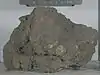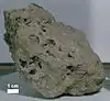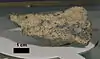 | 15498 | ![]() | brecha | Una brecha angular en bloques, recubierta de vidrio con aproximadamente 10 % de clastos félsicos mayores de 1 mm. Los tamaños son seriados y la roca contiene de un 10 a un 15 % de clastos félsicos de 0.5 a 1.0 mm. El vidrio oscuro y vesicular en contacto con la brecha cubre partes de los cuatro lados de la roca. La matriz gris es cohesiva |