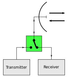 En el radar, un interruptor de transmisión/recepción (TR) conecta alternativamente el transmisor y el receptor a una antena compartida. En la disposición más simple, el interruptor consiste en un tubo de descarga de gas a través de los terminales de entrada del receptor. Cuando el transmisor está activo, el alto voltaje resultante hace que el tubo conduzca, cortocircuitando los terminales del receptor para protegerlo.Su interruptor complementario, el de transmisión/recepción (ATR), es un tubo de descarga similar que desacopla el transmisor de la antena mientras no está funcionando, para evitar que desperdicie la energía recibida.Con el mismo concepto, pero con tecnología de estado sólido, Hitachi tiene la patente US 7659795 B2 de un duplexor multibanda para terminales GSM, del tipo "Tx-Rx switched" (TDD) aunque con frecuencias Tx-Rx diferentes, normalmente utilizadas en la tecnología FDD ( "Tx-Rx simultaneous").[3]