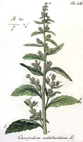 Ilustración de Dysphania anthelmintica (bajo su basónimo Chenopodium anthelminticum) en Vervolg ob de Avbeeldingen der artseny-gewassen met derzelver Nederduitsche en Latynsche beschryvingen, Adolphus Ypey, 1813.