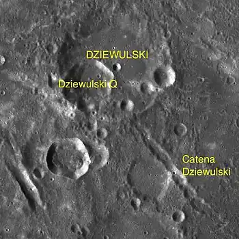 Por convención estos elementos son identificados en los mapas lunares poniendo la letra en el lado del punto medio del cráter que está más cerca de Dziewulski.