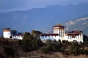 Véase la torre central del dzong (utse) ubicada en una pared exterior.