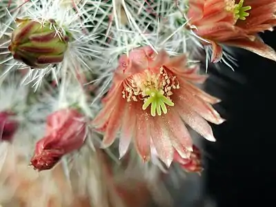 Crece de manera solitaria o ramificada desde la base. Los tallos son erectos, de forma cilíndrica y de 7 a 25 cm de alto y 6 cm de ancho. Tiene de 10 a 18 costillas tuberculadas. Tiene de 7 a 12 espinas centrales, son diveregentes de color rojizo, crema o pardo de 3 cm de largo. Posee de 30 a 45 espinas radiales, rojizas o pardas de 18 mm de largo. La flor crece a los lados del tallo, es corta funeliforme, de color rojizo claro y de 3 cm de largo. El fruto que produce es redondeado de color verde y tiene muchas espinas.[3][4]