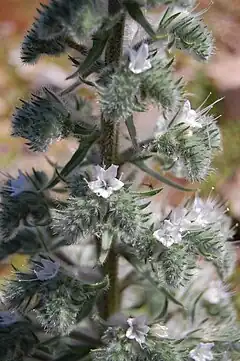 Estas dos últimas subespecies son nativas de la región del Mediterráneo. En España se encuentran en Alicante, Barcelona, Gerona, Islas Baleares, Lérida y Tarragona. Se encuentran en los campos incultos, márgenes de caminos, etc. Son hierbas bianuales, tienen una roseta de hojas lanceoladas bastante grande, cerca de 40 cm, de largo, muy áspera al tacto. Se caracterizan sobre todo por su inflorescencia que es alta, erecta, con forma cilíndrica, está cubierta por pelos rígidos que pinchan; las flores son blancas de 1 cm de largo aproximadamente. La subespecie pyrenaicum se diferencia porque tiene una inflorescencia más o menos cónica y tiene flores rosadas. Cuando están en flor las inflorescencias sobresalen entre el resto de hierbas de los campos, por lo que son muy fáciles de reconocer. Florecen en el mes de mayo y junio.[7]