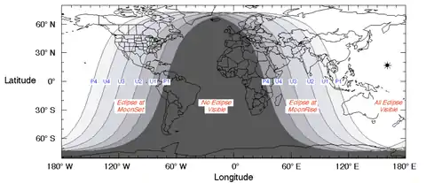 El siguiente mapa muestra las regiones desde las cuales fue posible ver el eclipse. En gris, las zonas que no observaron el eclipse; en blanco, las que sí lo vieron; y en celeste, las regiones que pudieron ver el eclipse durante la salida o puesta de la luna.