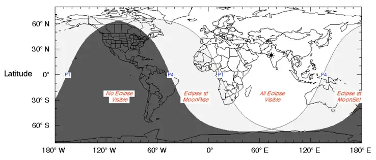 El siguiente mapa muestra las regiones desde las cuales será posible ver el eclipse. En gris, las zonas que no observarán el eclipse; en blanco, las que si lo verán; y en celeste, las regiones que podrán ver el eclipse durante la salida o puesta de la luna.