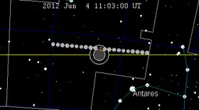 ![]() Representación del movimiento por hora de la Luna a través de la sombra de la Tierra en la constelación de Ofiuco. | |