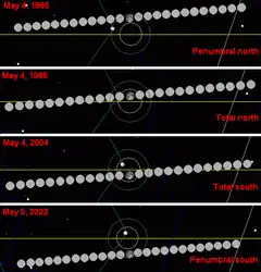 | Saros | Fecha | Tipo | Gamma | Saros | Fecha | Tipo | Gamma | |