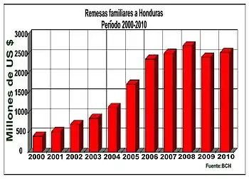 En la actualidad Honduras depende mucho de las remesas, tanto que estas representan alrededor del 25 % del producto interno bruto (PIB) y en los últimos años se han constituido en uno de los principales sustentos de muchas familias hondureñas.[25]