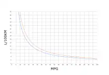 - Generalmente expresado en litros por cada 100 kilómetros (L/100km), utilizado en la mayoría de países europeos, China, Sudáfrica, Australia y Nueva Zelanda. Las leyes británicas, irlandesas y canadienses, permiten el uso de litros por cada 100 kilómetros o millas por galón imperial.[1][2][3][4] La calcomanía en la ventana de los automóviles estadounidenses nuevos muestra el consumo de combustible del vehículo en galones estadounidenses por cada 100 millas, además del número tradicional de MPG.[5] Un número más bajo significa que el consumo más eficiente, mientras que un número más alto significa que es menos eficiente.