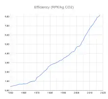 El consumo medio de combustible de las nuevas aeronaves se redujo en un 45% entre 1968 y 2014, lo que supone una reducción anual compuesta del 1,3% con una tasa de reducción variable. En 2018, las emisiones de CO₂ ascendieron a 747 millones de toneladas para el transporte de pasajeros, para 8,5 billones de ingresos por pasajeros (RPK), lo que supone una media de 88 gramos de CO₂ por RPK.[2] Un 88g de CO₂/km representa 3,1 g de combustible por km, o un 3,5l/100 km de consumo de combustible.