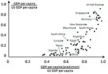 Para distinguir la parte del PIB explicada por la educación de otras causas, Weil[5] ha calculado el incremento en el PIB que debería esperarse basándose en los datos de la escolarización promedio. Esto se basó en los cálculos antes mencionados de Hall y Jones en los retornos de la educación. Los PIB predichos por los cálculos de Weil pueden ser trazados frente a los reales, tal y como está hecho en la figura a la izquierda, demostrando que la variación en la educación explica alguna, pero no toda la variación del PIB.
