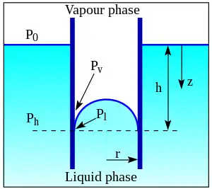 La ecuación de Kelvin describe el cambio en la presión de vapor debido a una interfaz curva líquido-vapor, como la superficie de una gota. La presión de vapor en una superficie curva convexa es más alta que en una superficie plana. La ecuación de Kelvin depende de los principios termodinámicos y no alude a propiedades especiales de los materiales. También se utiliza para la determinación de la distribución del tamaño de los poros de un medio poroso utilizando porosimetría de adsorción. La ecuación lleva el nombre de William Thomson, también conocido como Lord Kelvin.