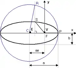 La circunferencia principal tiene una relación de afinidad entre sus ordenadas y las ordenadas de la elipse pues son más grandes por un factor . A cualquier punto de la elipse corresponde un punto de la circunferencia principal. El ángulo es la anomalía excéntrica (el ángulo ), mientras que el ángulo es la anomalía verdadera.