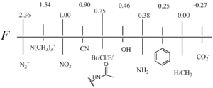 Las constantes se basaron primero en tres reacciones previas (σm, σp, σp+), lo que conduce a más errores posibles desde que se compilaron los datos es solo una combinación mínima de un grupo mucho más grande. Al ver un posible error en este conjunto limitado, el conjunto de datos se aumentó asignando una escala para comenzar. Se usa una escala cero para el hidrógeno, ya que se sabe que no dona o acepta fácilmente la densidad de electrones cuando se une a un átomo de carbono debido a electronegatividades similares. Un valor de 1 se asigna al NO2, porque la investigación previa determinó que el efecto de este sustituyente se debía predominantemente a la resonancia.[4] Por último, F se estableció igual a R para ambos componentes para que los efectos de campo se puedan comparar directamente con los efectos de resonancia. Esto luego conduce a: