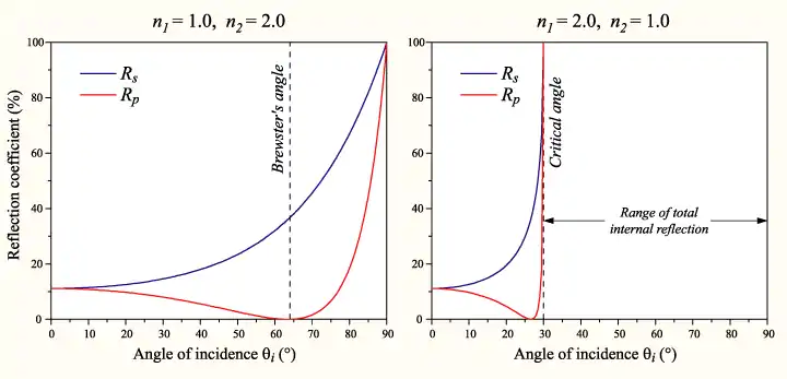 En el caso en que se pasa de un medio de mayor densidad a otro menor (n1 > n2), según se va aumentando el ángulo de incidencia, se llega a un punto en que toda la luz es reflejada. En ángulo de incidencia que forma el rayo, en esta situación, se denomina Ángulo Crítico, y en este punto, RS = RP = 1. Este fenómeno es conocido como Reflexión Interna Total. Para el vidrio-aire, el Ángulo Crítico está en torno a los 41°.