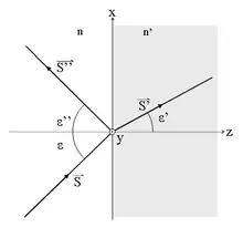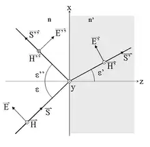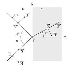 Cuando una onda electromagnética que se desplaza por un medio caracterizado por un índice de refracción , incide sobre la interfaz con otro medio que posee un índice de refracción , una parte de la onda se refleja y otra porción se transmite al otro medio. Las fórmulas de Fresnel dan una descripción completa y detallada del comportamiento de la onda, tanto en la onda que se refleja como en la onda que se transmite al segundo medio. La dirección de propagación de una onda electromagnética es siempre perpendicular a sus vectores eléctricos y magnéticos, por lo que uno de estos vectores debe estar en el plano de incidencia. Consideraremos que la onda electromagnética está polarizada elípticamente, ésta siempre va a poder expresarse mediante dos vectores perpendiculares en el plano de incidencia. Llamaremos al vector paralelo al plano de incidencia como y al vector perpendicular a éste plano como . Simplificando el problema, sin perder generalidad, podemos describir a estos vectores así: