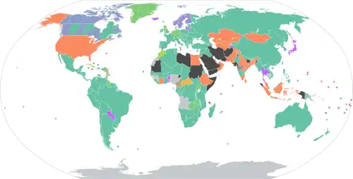 La mayoría de las leyes se aplican solo al consumo de alcohol en lugares públicos con el consumo de alcohol en el hogar en su mayoría no regulado (una excepción es el Reino Unido, que tiene una edad legal mínima de cinco años para el consumo supervisado en lugares privados). Algunos países también tienen diferentes límites de edad para diferentes tipos de bebidas alcohólicas .[1]