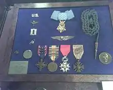 Edward V. Rickenbacker, coronel, especialista en la reserva, entonces teniente primero, 94.º Escuadrón, Servicio Aéreo, Fuerzas Expedicionarias Estadounidenses. Por su destacada gallardía e intrepidez más allá de la llamada del deber en la acción contra el enemigo cerca de Billy, Francia, el 25 de septiembre de 1918. Mientras volaba en una patrulla voluntaria sobre las líneas de combate, el teniente Rickenbacker atacó siete aviones enemigos (cinco del tipo Fokker que protegían dos aviones fotográficos del tipo Halberstadt). Sin tener en cuenta las probabilidades en su contra, se lanzó sobre ellos y derribó a uno de los Fokker tras dejarlo fuera de control. Luego atacó a uno de los Halberstadts y lo derribó también ...