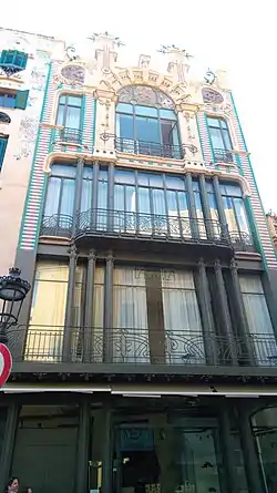 La estructura consta de cuatro plantas. En la fachada hay balcones con barandillas de hierro ondulado que dan un gran dinamismo, cerámicas policromas y una profusa decoración floral y vegetal según la técnica modernista del arte nuevo. Destaca el conjunto de un arco de medio punto decorativo.