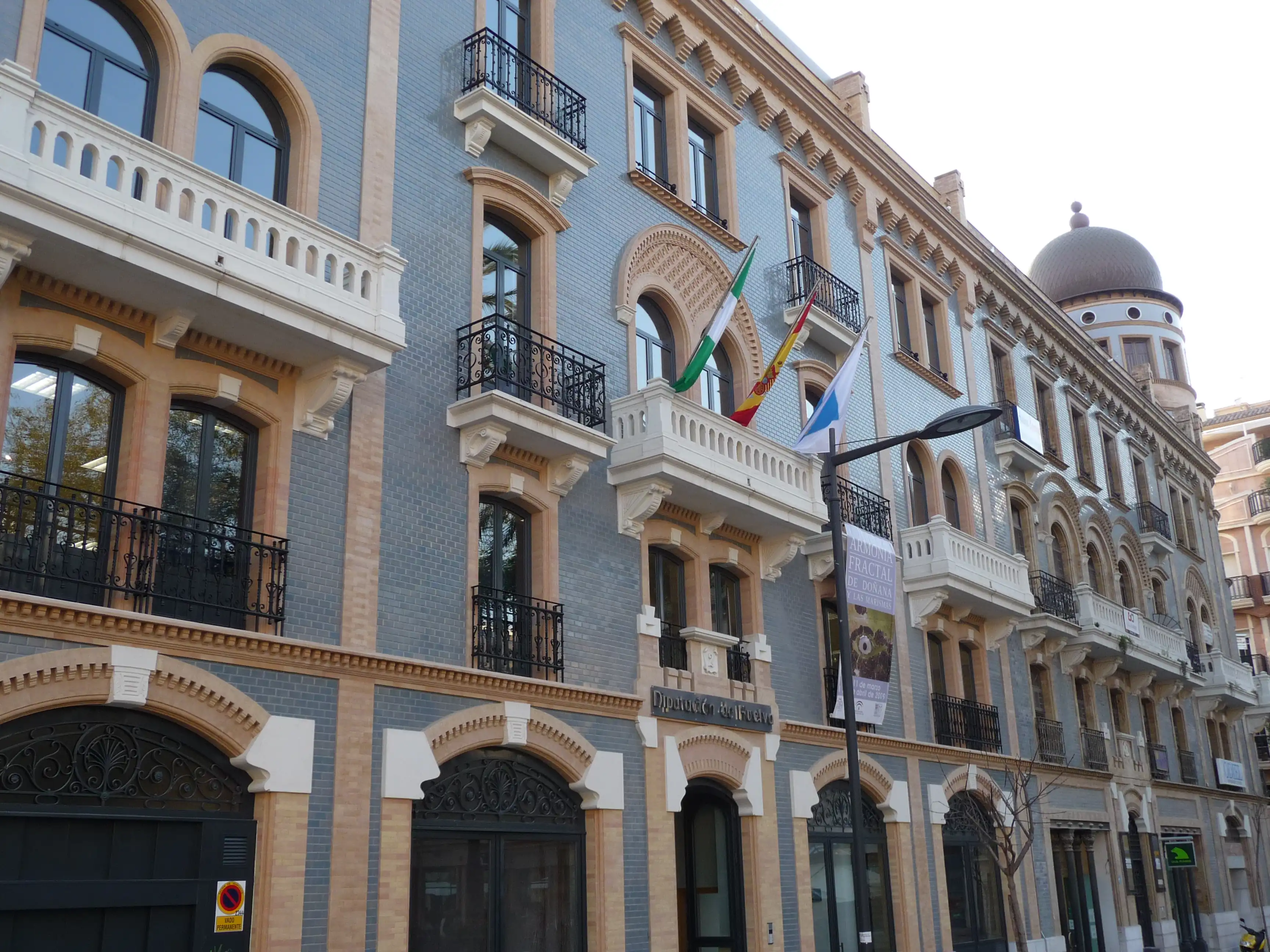 Situado en la actual Plaza de las Monjas, en pleno centro de la capital y en la trasera del Palacio del Duque de Medina Sidonia, fue un encargo de Antonio García Ramos al arquitecto Francisco Monís y Morales culminado en 1907. Con la tipología de casa de pisos propia de la época, Monís diseñó un edificio dividido en dos sectores independientes. El número 1 fue diseñado como edificio para viviendas y comercios mientras que el número 2 como hotel propiamente dicho. La fachada contiene elementos tanto clasicistas como modernistas, destacando el ladrillo visto y los azulejos, con un remate en el segundo edificio de cúpula esférica en tres cuartos.