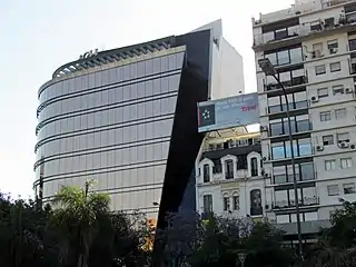 Nuestro edificio respeta ese orden [el de la avenida 9 de Julio] y busca la materialización de la cornisa y la forma inclinada de los gálibos a través de la yuxtaposición de dos superficies cilíndricas de ejes horizontal y vertical. Sobre Marcelo T. de Alvear, el [Teatro] Coliseo exige una apertura visual a su austera fachada modernista, para lo cual un plano inclinado permite una mejor apreciación del noble edificio. (...)