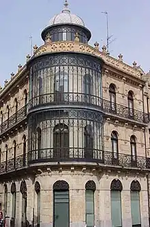 El proyecto es obra de Cecilio González-Domingo de 1909, quien diseñó un mirador circular haciendo juego con un pabellón cupuliforme del ático. El empleo del hierro y del cristal produce un efecto de ligereza. Las labras decorativas de la piedra se extienden por el resto de los parámetros alcanzando mayor densidad en la zona próxima a la cornisa donde se sitúa la crestería calada habitual en los diseños del arquitecto.. Las dovelas, las ménsulas y los frisos son objeto de una decoración minuciosa que tiene como objeto captar la mirada del espectador y despertar su goce sensual inmediato.