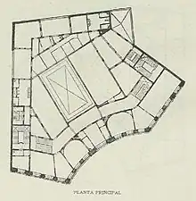 El programa de necesidades incluía oficina bancaria y servicios de la entidad en las dos plantas de sótano, planta baja y primera, y viviendas de alquiler en las tres superiores. A través de un zaguán o vestíbulo situado en el eje de simetría del edificio, se accedía a un patio de operaciones rectangular y en doble altura, porticado en planta baja y acristalado en entresuelo, realizado con pilares de fundición, cancelas y antepechos del mismo material decorados con motivos vegetales próximos a la estética modernista y cubierto por un lucernario acristalado. Los documentos gráficos de época atestiguan el interés de este espacio, que quizás no alcanzaba la riqueza del proyectado para el Banco de España pero que tenía un valor incuestionable. Bajo el suelo traslúcido de pavés del patio central se reproducía en los sótanos otro espacio singular en doble altura de similares características, con galería perimetral sustentada por ménsulas y barandillas artísticas de forja. En este patio situado en los sótanos se encontraban la caja del banco y las cajas de alquiler.[6] Alrededor del patio de operaciones, varios patios secundarios también cubiertos con lucernarios en la zona de oficinas ayudaban a distribuir los espacios, dando como resultado un conjunto ordenado de clara legibilidad. La planta primera o entresuelo tenía una organización funcional con despachos en fachada y oficinas acristaladas volcadas hacia el patio de operaciones. El espacio que ocupaba el eje de la fachada de la plaza se situaba a una cota algo superior para dar mayor altura al vestíbulo o zaguán. A las tres plantas superiores, destinadas a viviendas, se accedía por dos escaleras independientes[6] situadas en las medianerías del solar. El edificio tenía, por tanto, tres accesos dispuestos simétricamente, que se reflejaban claramente en la composición de la fachada.