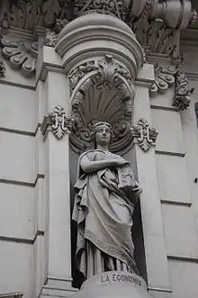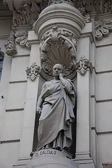 La decoración escultórica de la fachada, de gran calidad y cuidado diseño, está al servicio de la arquitectura y se localiza en ménsulas, dinteles de huecos, claves de los arcos, frisos de entablamentos y remates de balaustradas. Entre los elementos decorativos que se repiten de forma sistemática hay que citar serpientes entrelazadas del basamento o flores de lis en las tarjas o cornucopias. Dentro del conjunto destacan los dos edículos que flanquean la puerta principal, con peanas y doseles de abigarrado diseño y profusa decoración vegetal de estilo neorrenacentista, donde se ubican las figuras alegóricas El Cálculo —representado como un varón con toga que se lleva pensativo la mano a la cabeza— y La Economía —doncella con túnica y un arca entre las manos—,[7] obras del escultor José Alcoverro.
