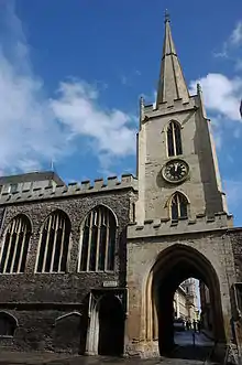 Iglesia de San Juan Bautista con la torre sobre la puerta de la ciudad.