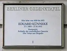 Placa dedicada a Eduard Künneke en su domicilio del distrito de Charlottenburg, Berlín