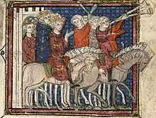 Mientras tanto, el conde de Pembroke había estado negociando con Francia para resolver los desacuerdos de varios años atrás sobre la administración de Gascuña y, como parte de esto, Eduardo e Isabel convinieron viajar a París en junio de 1313 para reunirse con Felipe IV.[199] Eduardo probablemente esperaba que ambos resolvieran los problemas en el sur de Francia y recibir el respaldo de Felipe IV sobre la disputa con los barones; para el rey francés era una oportunidad para impresionar a su yerno con su poder y riqueza.[200] Resultó una visita espectacular, con una gran ceremonia en la que los dos reyes nombraron caballeros a los hijos de Felipe IV y otros 200 hombres en Notre-Dame, grandes banquetes en la ribera del Sena y una declaración pública de que ambos monarcas y sus esposas se unirían al Levante.[201] Felipe IV dio condiciones indulgentes para resolver los problemas en Gascuña y el evento fue estropeado por un grave incendio en los aposentos de Eduardo.[202]