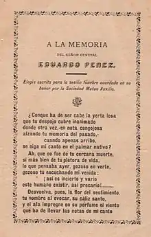 La Sociedad de Mutuo Auxilio de Maracaibo realizó una sesión fúnebre durante los funerales del General Eduardo Pérez Fabelo en 1895. El discurso de orden fue una elegía de 33 páginas, escrita y pronunciada por el poeta e intelectual zuliano Octavio Hernández.