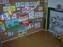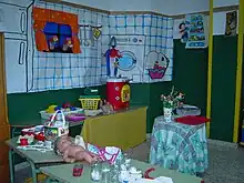 - Los rincones:[20] el trabajo por rincones en el aula es una forma de organización que permite en el alumnado el desarrollo de hábitos elementales de trabajo, el establecimiento y cumplimiento de normas y —ante todo— el desarrollo de su autonomía. Esta metodología se basa en los modelos o paradigmas ecológicos de autores como Doyle o Bronfenbernner. Para ello el aula se divide en varios espacios de trabajo preorganizados por el maestro y que previa elaboración de normas de uso los propios niños administran. Ejemplos de rincones comunes en esta etapa pueden ser: la cocinita, la tienda, las construcciones, la biblioteca de clase, la asamblea, lógica-matemática, observación, rincón del inventor... y cualesquiera que puedan adaptarse a las necesidades e intereses del alumnado.