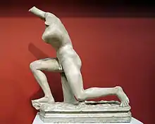 El mármol sin cabeza es una copia de un bronce griego perdido, como lo demuestra un extraño apoyo en forma de tronco de árbol y "el fracaso del conjunto de la silueta, deformada para mantenerla dentro de los límites de un solo bloque de piedra", como observa Rhys Carpenter ; es improbable que sea posterior a Neron, debido a la ubicación donde fue encontrado.[2] La fecha del original en bronce que copia es refutada. En el momento de su hallazgo August Kalkmann dio una fecha aproximada de comienzos del siglo V a. C.[3] pero antes de la Segunda Guerra Mundial, la opinión general la situaba a finales del siglo IV a. C. en el giro hacia el estilo helenístico, a lo que Rhys Carpenter se opuso, sugieriedo en cambio los años 60 o 70 del siglo quinto.[4] Brunilde Sismondo Ridgway, en una nueva datación radical de la historia de la escultura griega, la ha colocado entre las obras clasicistas del siglo I a. C.[5]