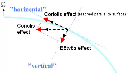 Los diagramas muestran también la componente tangente a la superficie local. En meteorología y en oceanografía, es habitual referirse a los efectos de la componente paralela a la superficie local como efecto Coriolis.