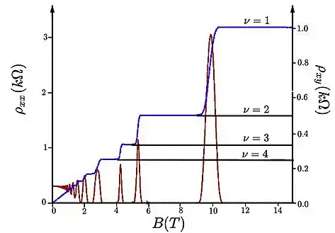 Cuando es un número entero, la energía de Fermi se encuentra entre los niveles de Landau, donde no hay estados disponibles para los portadores, por lo que la conductividad se vuelve cero (se considera que el campo magnético es lo suficientemente grande como para que no haya solapamiento entre los niveles de Landau, de lo contrario habría pocos electrones y la conductividad sería aproximadamente ). En consecuencia, la resistividad también se vuelve cero (en campos magnéticos muy altos se puede demostrar que la conductividad y la resistividad longitudinales son proporcionales[9]).