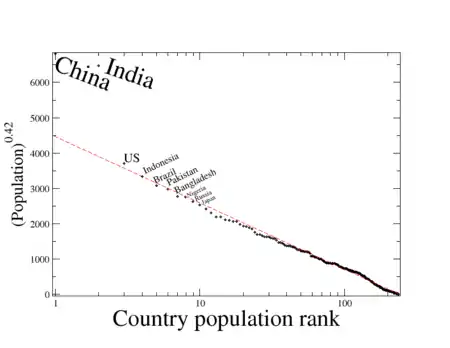 - Tamaños de ciudades francesas (donde el punto que representa a París es el "Rey", no se ajusta a la función exponencial alargada[1] ), y de manera similar para otros países con una ciudad principal, como el Reino Unido (Londres), y el caso extremo de Bangkok (ver lista de ciudades en Tailandia).