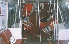 ![]() Resultado del accidente ferroviario de St Johns de 1898, donde los dos coches traseros de un tren de pasajeros sufrieron el efecto telescópico al ser golpeados a 8 mph (12,9 km/h) por el tren que los seguía |