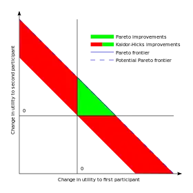 Usando el criterio de eficiencia de Kaldor-Hicks, un resultado es más eficaz si los que se benefician de un cambio pueden, en teoría, compensar a aquellos que sufren las consecuencias, lo que da un resultado mejor de acuerdo con Pareto. Por ejemplo, un intercambio voluntario que crea contaminación sería una mejora de Kaldor-Hicks, si los compradores y los vendedores todavía están dispuestos a llevar a cabo la transacción, incluso si tienen que compensar plenamente a las víctimas de la contaminación.