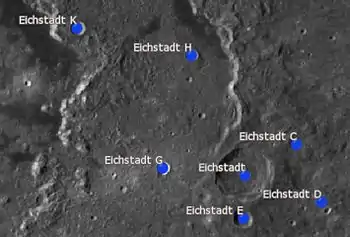 ![]() Imagen de la misión Lunar Orbiter 4 de Eichstadt, con Eichstadt E abajo en el centro | ||