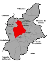 Limita con las parroquias de Vilar de Ortelle y San Vicente de Castillón al norte, Castillón, Ferreira y Deade al este, Seguín al sur y Atán al suroeste.