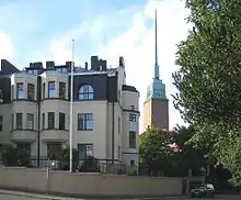 Un edificio habitacional y la iglesia de Mikael Agricola en Eira.