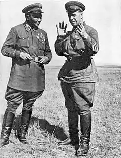 En la Batalla de Nomonhan de 1939, fuerzas fuertemente armadas del Ejército Rojo al mando de Georgui Zhukov asistidas por tropas mongolas al mando de Horloogiyn Choybalsan derrotaron decisivamente al Ejército Imperial Japonés bajo Michitarō Komatsubara. Durante una reunión con Iósif Stalin en Moscú a principios de 1944, Choibalsan solicitó asistencia militar al EPM para la protección de fronteras.[9] Las unidades del Ejército Popular de Mongolia también fueron apoyadas y aliada con el Ejército Rojo soviético en el flanco occidental de la invasión soviética de Manchuria en 1945.
